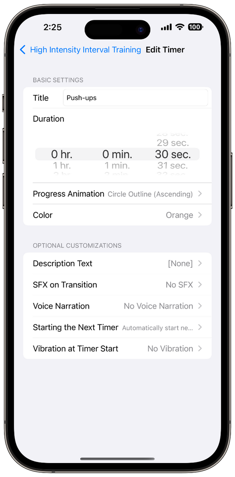 While editing a Cue, individual timers can each be customized with sound effects, animations, voice narration, and more!Customization options for timers include: