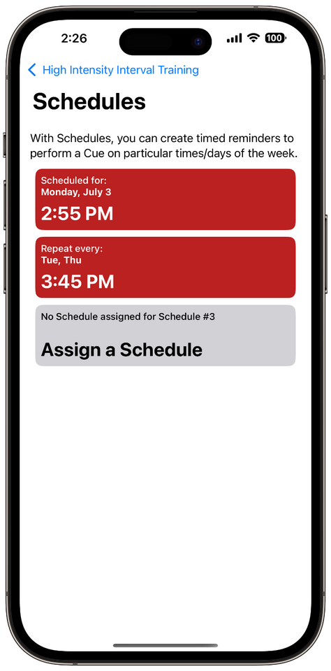 Trying to start a new goal or habit?Use Cue It: Interval Timer's Schedule feature to remind you to perform a Cue at certain time periods.You can set timed reminders for a specific time and date, or repeating reminders on certain weekdays at a set time.