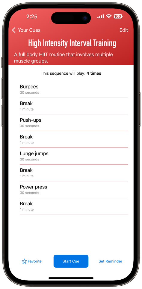 With Cue It: Interval Timer, you can create "Cues" - lists of countdown timers in a sequence. When one timer ends, the next timer starts right after. Cues can help you stay on track when performing a task or routine with time-sensitive steps.